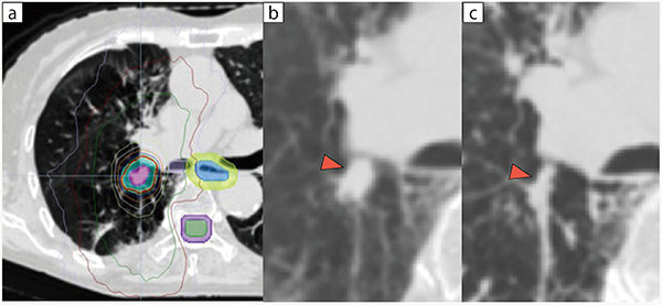a:線量分布図,b:治療前のCT(▶腫瘍),c:照射期間中のCT(▶腫瘍)