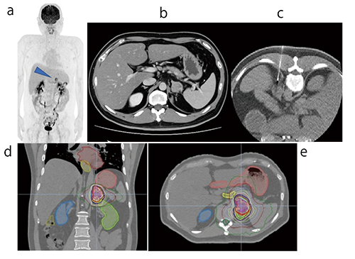 FDG-PET画像では副腎のみのオリゴ転移であった (a▶,b)。フィデューシャルマーカー挿入後に,動体追尾での定位照射を実施した(d,e)。なお,副腎腫瘍でのフィデューシャルマーカーは適応外使用となる(c)。