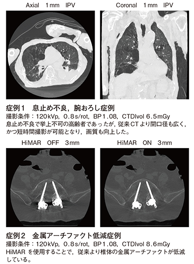 また,金属アーチファクト低減技術「HiMAR(High Quality Metal Artifact Reduction)」も実装されており,伊藤部長は「股関節に人工骨頭を留置している場合でも金属アーチファクトがしっかり抑制され,金属周囲の軟部組織も評価が可能です」と有用性を述べる。吉川技師長は,「HiMARは撮影後に適用できるため,必要に応じて再構成しています。脊椎にインプラントが埋め込まれた腰椎術後の症例でも,アーチファクトを低減した画像を得ることができ,MPRや3D画像の作成が容易です」と,画像処理においてもメリットが大きいと話す。