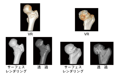 図2 大腿骨頭のVR,サーフェスレンダリング,透過像