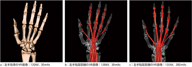 また,135kVの高管電圧を使用すると,FOV中心付近にある腱・靭帯のCT値低下に比べて周囲の筋肉のCT値低下が大きくなるため,相対的にコントラストを上昇できる。検査部位にもよるが,VR画像を作成する上で腱・靭帯と筋肉の分離がしやすくなる(図2,3)。