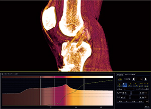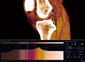 AZE VirtualPlaceでは,VRで使用しているカラーマップの配色がCT値のヒストグラムにも反映されており,この配色を見ながらオパシティカーブを調整できるため,反映されるVR画像の変化が理解しやすい。