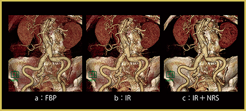 図1は,BMIが34,低用量造影剤で80kVp撮影という条件の厳しい症例であったが,FBP(a),IR(b)と比べ,IRにNRSを適用した画像(c)は血管がより明瞭になっている。NRSにより診断に有用な3D画像を得られることに加え,元画像のノイズを低減した上で3D画像処理を行うことで診療放射線技師の労力軽減につながる。
