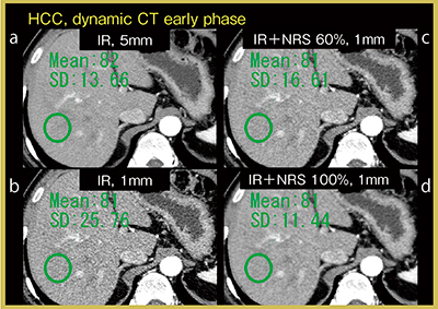 図3は肝細胞がんの症例で,IR画像,NRS適用画像のSDを比較すると,IRの5mmスライス厚(a)よりもNRSを適用した1mmスライス厚(d)の方が低い値を示した。NRSによりノイズの少ない画像で読影ができ,アドバンテージが高いと言える。