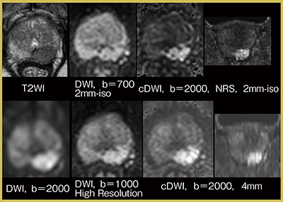 また,thin sliceからcomputed DWI(cDWI)を作成する際にNRSでノイズを低減しておくことで,b=2000などのultra high b値でも高分解能な画像を得られる(図5)。このほか,Zoomイメージングや血管撮像においても,高分解能化で増えたノイズを低減するためにNRSは有用である。