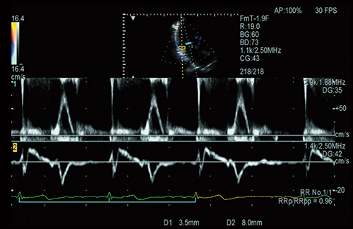 また,ASE/EACVIガイドライン9)では,E波とe’波の拡張の開始時間の差(TE-e’)を計測することを推奨している。健常例では,e’波の方がE波よりも早く開始するのに対し,心不全の進行に伴いe’波の開始が遅れ,左房圧の上昇を評価できると報告されている。さらに,TE-e’から肺動脈楔入圧(PAWP)>12mmHgを予測できることが報告されている7)。図2は,経カテーテル大動脈弁留置術(以下,TAVI)前後における拡張のタイミングのズレだが,TAVI前後で僧帽弁口血流速波形には変化がないが,左房圧の減少に伴いTE-e’がTAVI後に短縮することが一目でわかる。TE-e’から左室充満圧と左室弛緩のバランスを加味した拡張機能の評価が可能であり,正確な時間差を計測するためにはDual Gate Dopplerが必要である。