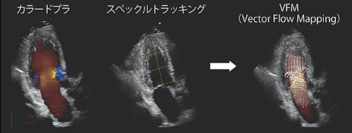 VFMでは,カラードプラ画像を取得することにより,カラードプラによる血流速度情報と2D画像のトラッキング技術による壁運動情報を用いて,容易に心臓・血管内腔の速度ベクトル分布を得ることができ(図3),さまざまな研究により精度,再現性が検証ずみである12)〜14)。