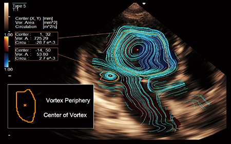 VFMでは,フレームごとの渦の外周を自動検出し,渦の中心位置や面積を求めるだけでなく,渦領域内の渦度からCirculationを算出することができる(図4)。心不全例では,等容性収縮期に,正常とは異なり心尖部に渦が検出されることや,左室同期不全例では拡張期に別の渦が形成され,血流が分離する現象も見られる(図5)。渦は流れの効率性を考える上で重要な役割を果たしており,Circulation指標により渦特性の評価が可能である。