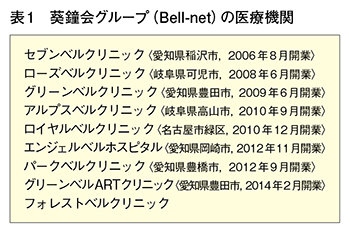 医療法人葵鐘会は,愛知,岐阜で8つの産科クリニックと1つの病院を運営する(表1)。2014年7月には,名古屋城に近い名古屋市西区に新たにキャッスルベルクリニックをオープン予定で,グループ内の医師が連携して産婦人科医2名体制による24時間365日の管理体制を構築する“ベルネット”方式によって,安心安全の周産期医療を提供するネットワークを広げている。さらに,経済産業省の2013年度「日本の医療機器・サービスの海外展開に関する調査事業」において,葵鐘会を代表団体とする「ベトナムにおける日本式周産期医療提供プロジェクト」が採択され海外展開も進めている。