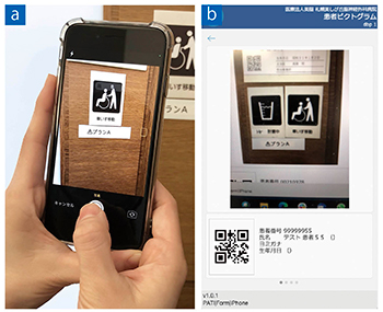 b:患者ID(QRコード)を読み込み,撮影したピクトグラムを確認し対応する。