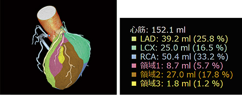 広く普及している冠動脈CT検査であるが,VINCENTは,各血管領域におけるボロノイ法を利用した心筋支配領域の算出機能を有している。この機能を用いた心筋灌流量(myocardial mass at-risk:MMAR)の評価は,冠動脈治療の戦略の一助となっている(図1)。