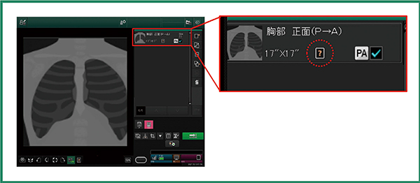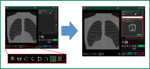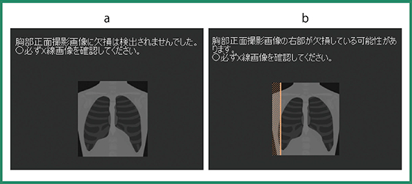 肺野全体が写っている画像が求められるが,肺野全体が入っていないと推定された場合は,その欠損の可能性のある箇所を示したイラストと説明文をConsole Advanceに表示し注意を促す(図4)。