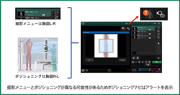 当社では,2020年10月にAI技術を用いた“ポジショニングナビ機能”を搭載したX線診断システム「CALNEO Compact」*4を発売している。ポジショニングナビ機能は,X線撮影時にあらかじめ登録した撮影メニューと被検者のポジショニングが一致しない場合にConsole Advanceにアラートを表示する機能で,ポジショニングの不整合による再撮影低減に貢献してきた(図6)。