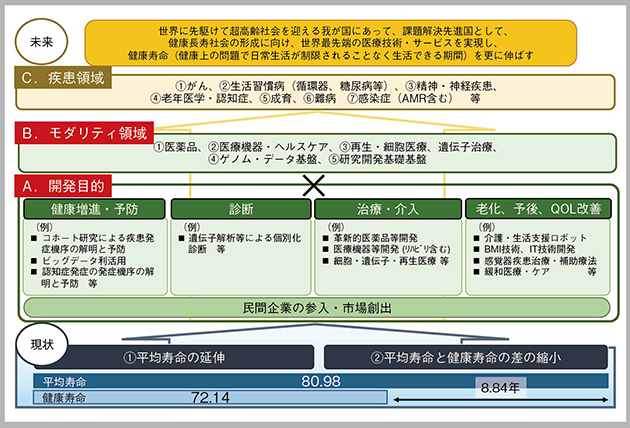 従来,医療分野のイノベーションの研究開発は,国立研究開発法人科学技術振興機構(JST)などを中心に行われてきたが,2014年に日本の健康・医療分野の司令塔として健康・医療戦略推進本部が設置された(https://www.kantei.go.jp/jp/singi/kenkouiryou/ )。2015年には,国立研究開発法人日本医療研究開発機構(AMED)も設立された。