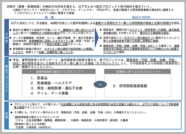 健康・医療戦略および医療分野研究開発推進計画は,現在,2020年度以降の方向性を検討している。現行のプロジェクトの課題として,同一技術の開発が複数の疾患領域で行われていたり,認知症や糖尿病・循環器疾患などの慢性疾患が対象疾患として設定されていないことに加え,健康寿命延伸の観点から,予防やQOL改善なども重視する必要がある。