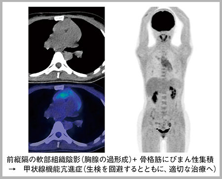 症例1は,30歳代,女性。呼吸器外科より前縦隔腫瘍の転移巣検索が依頼され,PETを撮像したところ,前縦隔の腫瘤のみならず,骨格筋にもびまん性の集積が認められた(図1)。集積パターンから甲状腺機能亢進症を疑ったところ,甲状腺ホルモンの著明な高値,甲状腺刺激ホルモンの低値を認め,甲状線機能亢進症の診断,治療が開始された。予定されていた手術のみならず,生検も回避することができた。