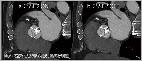 SnapShot Freeze 2は,冠動脈に特化した動き補正技術“SnapShot Freeze”(0.35s/rot,時間分解能29ms)の進化版で,0.28s/rot,時間分解能24msにより,心臓全体の動き補正が可能となる。オプティカルフローなどの基礎原理を用い,画像の動きをトラッキングして三次元的な構造と軌道に置き換え,動き量をベクトル演算解析することで形状を復元。これにより,ハーフ再構成と比較し6倍のモーションアーチファクト抑制を実現した。動きのある心臓においてもブレのない静止画像が得られるため,冠動脈や僧帽弁,大動脈弁などの描出能が向上する。また,経カテーテル大動脈弁留置術(TAVI)後の画像では,自己拡張型人工弁のアーチファクトが抑制され,きわめて明瞭に観察可能となる。