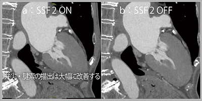 症例2は肥大型心筋症を伴う僧帽弁閉鎖不全症に対しMitraClip治療を行った症例である。SnapShot Freeze 2を適用したCT画像では,経食道心エコーで不明瞭であった後尖の接合部付近のCFZが確認できた。また,SnapShot Freeze 2の適用の有無を比較すると(図2),適用なしの画像(b)では弁尖が消失しているが,適用ありの画像(a)では弁尖の全体像や腱索も明瞭に描出されている。