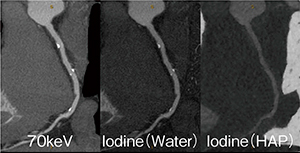 Cardiac Imagingにおいて,低エネルギーkeV画像はコントラスト差が大きくプラーク診断に有用であり,高エネルギーkeV画像はビームハードニングの影響を抑えたステント内腔の評価に有用である(図2)。同時に,両エネルギーの時間位相差のないraw dataが得られることで,“水”と“ヨード”に着目した計算から,物質の密度値や密度画像を構築することが可能である。心臓領域においては高度石灰化の近傍評価などに有用で,冠動脈石灰化の主成分とされるハイドロキシアパタイト(HAP)などの密度値をNullにしたヨード密度画像にて,石灰化からの影響を受けず内腔の診断が可能となる(図3)。この密度画像は,近年注目されるプラークの性状診断や心筋Perfusionにおいても有用性が期待されている。シングルエネルギーやCT値ベースのデュアルエネルギーではビームハードニングの影響を強く受ける下行大動脈と左室の間の領域においても,GSI Cardiacのヨード密度画像を用いることでビームハードニングによるCT値シフトの影響を受けず,精度の高い虚血診断能が期待される(図4)。