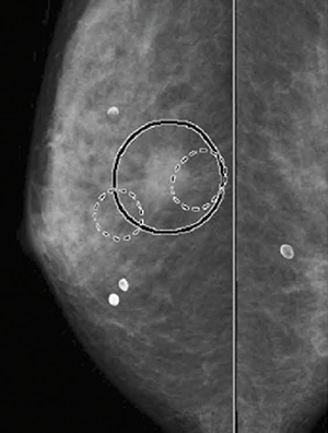 マンモグラフィCAD(computer-aided detection)は,マンモグラフィ画像から,微小石灰化クラスタおよび腫瘤陰影が疑われるエリアを自動的に検出し,画像上にマークで提示することにより読影医を支援する技術です。コニカミノルタのマンモグラフィCADシステム「NEOVISTA I-PACS CAD typeM」(図1)は,検診をはじめとしたマンモグラフィ読影の現場で活用され,「淡く細かい石灰化まで検出できるので安心できる」「長時間読影などで疲労を感じ始めた時に助けてくれる」「病変を覆い隠すことのない『自由曲線で囲む』マーキング表示が見やすい(図2)」などの評価を得ています。
