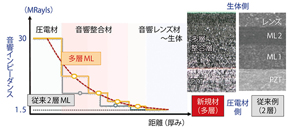画質改善の基本は,空間分解能とコントラスト分解能の向上である。空間分解能を改善するためには,プローブの高周波数化と広帯域化が必須の要件となる。これを実現するため,われわれはプローブの音響特性に影響を与えるすべての材料を見直した。特に,整合層では従来プローブの多くが2層整合層を用いていたのに対し,さらに多層化し,音響インピーダンスが疑似的に連続変化(傾斜整合層)するようにした(図1)。また,音響レンズはシリコンゴムを基材として,充填するフィラーの高比重化,ナノ粒子化,高分散化により,その音響減衰特性が大きく改善された。これらの技術により,高感度でかつ比帯域が100%を超える,非常に広帯域なプローブが実現した。