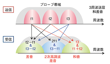 コントラスト分解能を改善する技術としては,これまで高調波イメージング技術が用いられてきた。一方,われわれは,前述した非常に広帯域なプローブの特性を最大限に生かすため,新たに3周波混合送受信技術(Triad Tissue Harmonic Imaging)を開発した(図2)。3周波成分を含んだ送信波を生体内に照射することで,生体の非線形性により多くの非線形成分がエコー信号として返ってくる。これを広帯域なプローブで余さず受信することで,浅部から深部まで均一な感度,空間分解能,コントラスト分解能を得ることができる。その結果,ポータブルでありながら大型機に迫る画質を実現した。