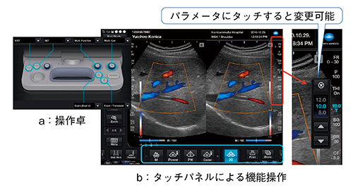ポータブル型装置では,操作卓の大きさに著しい制限を受ける。その中に大型機並みのスイッチ類を配置すると,スイッチが非常に小さくなり,操作性を劣化させる。われわれは,操作卓に配置するスイッチ類の数を極力少なくし,操作頻度の高いもののみを操作卓に配置した(図3 a)。各スイッチに割り当てる機能は,アプリケーションによって操作頻度が異なることに配慮し任意選択可能とした。また,操作卓に配置された機能で不足する分については,メインモニタにタッチパネルを貼付し,スマートフォン感覚で機能を操作できるようにした(図3 b)。