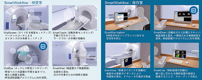 MRI検査は年々増加しており,生産性ならびに効率性の向上が望まれている。しかしながら,生産性の向上には患者が望む医療サービスの提供が不十分となるリスクをはらんでいる。“SmartWorkflowソリューション”は,MRI検査全体に一貫性を持たせ,患者とオペレータ両者の負担を低減し,患者中心の効率化された検査環境を提供する(図3)。検査室内においては,ガイド付き検査セットアップ“VitalScreen”やタッチレス呼吸同期システム“VitalEye”,自動患者センタリング,検査室内での検査開始といった機能を複合的に用いることにより,検査手順を可能なかぎり自動化することでオペレータが患者に集中しやすい環境をサポートする。SmartWorkflowソリューションの一つであるVitalEyeは,赤外線システムを用いた呼吸同期技術であり,患者にデバイスを使用せずに呼吸同期撮像が行え,小児や妊婦,仰向けが困難な患者といった呼吸センサーの使用が難しい患者であっても,スムーズに呼吸同期撮像が可能となる。また,呼吸波形認識アルゴリズムにAIが使用されていることで,従来の呼吸センサーよりも精度の高い同期撮像が可能である。さらに,操作室においても,検査計画や撮像,解析処理を自動化しオペレータの負担を軽減する機能や,患者に検査中の安心感を与える自動化された患者ガイダンス機能,MR条件付きインプラントを使用する患者の撮像にて簡便に安全な検査環境を提供する機能などを備えている。これらの患者を中心とした検査環境の改善が,スループットの向上と信頼性の高い診断をサポートする。