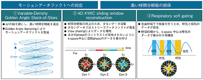 上腹部の造影ダイナミック検査において,最新の高速化技術である“Compressed SENSE”の開発により,大幅な撮像時間の短縮が図られ,一定の検査成功率向上の効果が得られている。しかし,短時間であっても息止めが困難な患者で課題が残っていた。近年,息止め不良患者への対応技術として注目されているのがradial scanである。radial scanは,k空間の中心を重複して充填することによる加算平均効果やk空間ラインの充填角度の最適化(pseudo golden angle)によりモーションアーチファクトを低減でき,自由呼吸下撮像が可能となる技術である。