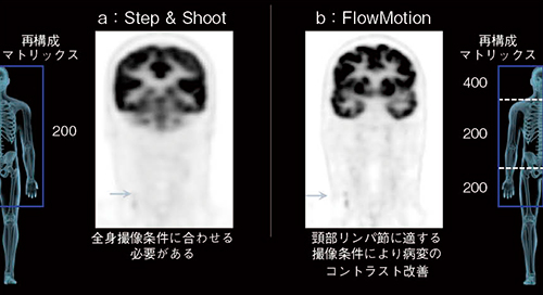 新しく開発された速度可変型寝台連続移動技術“FlowMotion”では,寝台を連続移動させながらPET撮像を行えることから,PETの体軸方向視野に制限されることなく,一度の全身撮像の中で,目的臓器ごとに適切な撮像範囲,撮像モード(呼吸同期),撮像時間,再構成条件(マトリックス,後処理フィルターなど)を指定することが可能である。検査時間の増加,CT被ばくを伴う追加撮像を行うことなく,目的の画質が得られることが期待される。