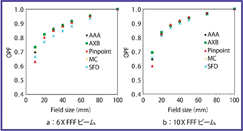 図3 6X FFFビーム(a)と10X FFFビーム(b)を使用した小照射野出力係数の検証