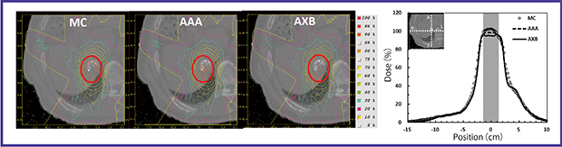 AAA, AXB〔治療計画装置「Eclipse」(バリアンメディカルシステムズ社製)の計算アルゴリズム〕,Pinpoint(電離箱線量計),MC(モンテカルロ計算),SFD(半導体線量計)の比較