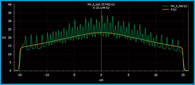 MLCを全閉し,MLC動作方向と垂直な方向のプロファイルを測定した。EPIDによる測定では山谷状のMLCのtransmissionが確認できるのに対し,PDIPによるpredictionはこれらの平均値を返す結果となった。