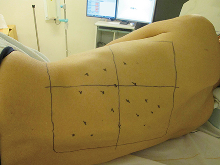 びまん性骨転移で仰臥位が不可能であったが,触診で圧痛のある部位に×印を付け右側臥位のまま電子線を20Gy/5回照射したところ,放射線治療終了時には背部痛は消失し仰臥位が可能となった。