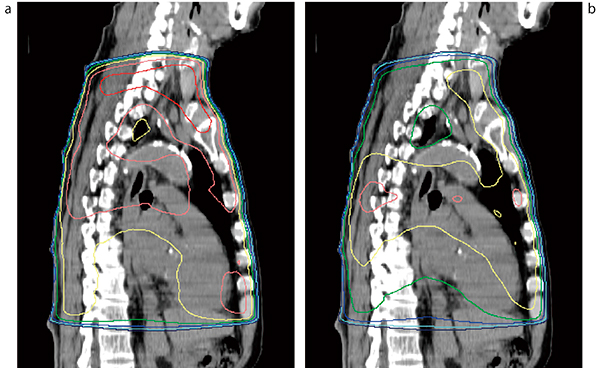 TrueBeamの導入により,照射野中心に比べ周辺の線量が高すぎる場合,適当な重みでFFFビームを加えて平坦度を改善できるようになった。特に全脳照射で有用であり(図4),進行食道がんの放射線治療でもFFFビームで頸部や腹部の過線量を軽減できる場合がある(図5)。