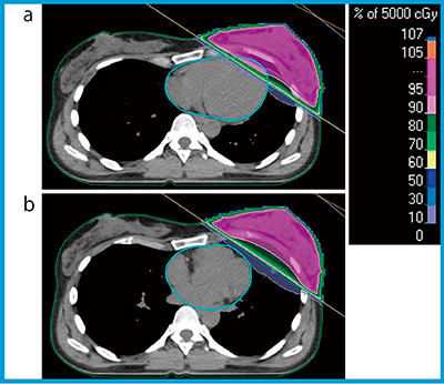 図1 全乳房照射における自由呼吸時(a)と深吸気息止め時(b)の
