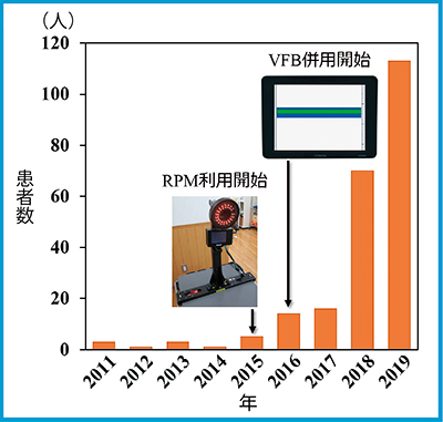 当院では,2011年に胸腹二点式呼吸モニタ用器具を用いたvDIBHを全乳房照射で開始した。当初は治療計画開始前および治療期間中に,治療計画用CT装置を用いた呼吸停止位置の確認を複数回行うなど,慎重に臨床適応を行った。ある程度知見が得られてからは,より多くの患者への本技術の提供をめざしている。2015年からは手技の簡便化のために呼吸モニタリングシステムをRPMに移行し,2016年からはスループット向上のためにVFBの併用を開始した(図2)。