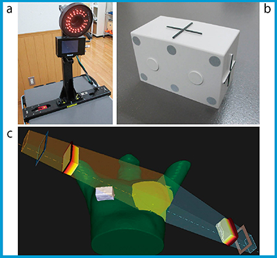 RPMは,赤外線カメラ(図3 a)を用いて体表面に設置した赤外線反射マーカー(図3 b)を検出し,マーカー位置のモニタリングおよびビーム制御を行うシステムである。当院では,全乳房DIBHの際はamplitudeモードを適用し,標的の対側胸部にマーカーを設置(図3 c)して,照射前および照射中の呼吸停止位置のモニタリングを行っている。