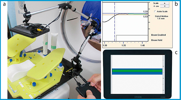 VFBは治療寝台にRPMのスレーブモニタを装着(図4 a)することで実施している。RPMにより取得されたマーカーの位置情報(図4 b)のうち,必要な情報をトリミングして表示(図4 c)することで,患者に自身の呼吸状態のフィードバックを行い,呼吸停止位置の視覚ガイドとしている。