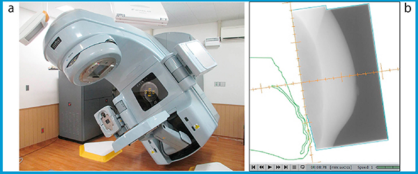 各種サロゲートマーカーによりモニタリングされる対象は,一部の体表面情報のみである。呼吸による体内構造(心臓の位置など)の変位を直接的に反映しているわけではないことに留意する必要がある。当院の場合,照射開始前および照射中に「On-Board Imager(OBI)」および「PortalVision」(共にバリアン社製)の放射線画像を用いて体内構造の確認を行っている(図5 a)。特に,照射中のシネ画像(図5 b)は治療ビームを利用するため,追加の撮影線量なしに多くの情報取得が可能であり有用である。