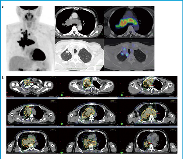 a:造影CTとPET画像。右上葉原発で対側縦隔に及ぶリンパ節転移を伴う。