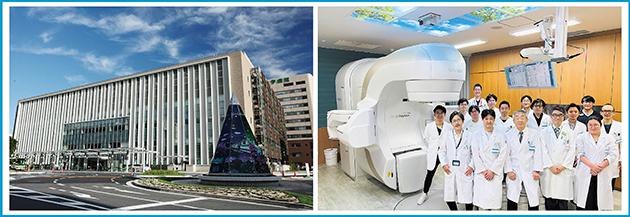 図1 広島大学病院(左)とTrueBeam室内の放射線治療スタッフ(右)