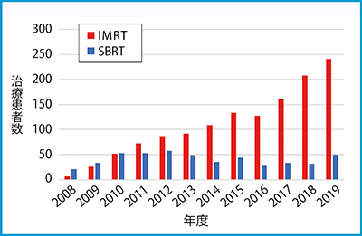 現在,高精度放射線治療である体幹部定位放射線治療(SBRT),強度変調放射線治療(IMRT)は,国内のハイボリューム施設において広く施行されるようになっている。当院でも,SBRT,IMRTともに早期より導入し,治療患者数は年々増加している(図2)。当院における高精度放射線治療の特徴は,広島がん高精度放射線治療センター(HIPRAC)と協同して診療を行っていることである。HIPRACは2015年に開設された,外来患者に特化した高精度放射線治療施設である。HIPRACで主に取り扱う治療は,前立腺がんIMRT,乳がん術後胸壁+鎖骨窩hybrid-IMRT,脳転移定位照射,肺・肝がんSBRTなどである。一方,広島大学では,化学療法併用症例,臨床試験症例を主な対象とし,頭頸部がん,脳腫瘍,頸部食道がんに対するIMRT,肺・肝がんSBRTを主に行ってきたが,現在ではIMRTは進行期肺がん,進行期食道がん,骨盤腫瘍,局所再発症例,SBRTはオリゴ転移にも適応を拡大している。当院のIMRTは患者スループット向上を考慮し,すべて強度変調回転放射線治療(VMAT)にて施行しており,肺・肝がんSBRTにも本技術を導入した。こうした積極的な適応拡大により,全治療患者中の高精度放射線治療率は,HIPRAC開設前の20〜25%から40〜50%に増加している。
