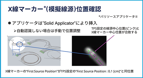 線量計算精度の評価では,「Brachytherapy Dosimetric Parameters」2)(University of Valencia提供)から線源パラメータを入手し,TPS登録値との確認および線量計算値と比較することにより計算精度を検証した。比較のため,任意の停留時間にて1つの線源からの線量分布の広がりを,線源中心より±10cmの範囲内でプロファイル評価した。線源中心から0.5cm以内での誤差は±10%程度と大きくなったが,それ以外はすべて±2%以内で良好に一致した。また,過去の実臨床症例を用いてタンデム-オボイド,シリンダー合わせて10症例の線量分布を計算し,ターゲット,リスク臓器の線量指標,グリッドサイズおよびその線量計算時間を評価した。従来,当院にて稼働していた他社製TPSにて得られた線量分布と比較し,各線量指標に大きな差はなく,BrachyVisionを用いても従来と同等の線量分布を得られることを確認した。計算グリッドサイズは,CTスライスXY方向に対し2.5mm2,1.25mm2,0.5mm2を比較し,ターゲット,リスク臓器の線量指標に大きな差がないことを確認した。一方,三次元線量分布の計算時間は,おのおの0.5秒以内,4秒以内,20秒以内と差を認めた。実臨床を考慮し,計算精度が同程度であることから,最も計算時間の短い2.5mm2グリッドサイズを実臨床で用いる運用とした。独立検証システムとして,各線源位置の停留時間から評価点における投与線量(AAPM-TG43)3)の計算式を基に独自計算して比較することで,停留時間の妥当性を評価した。BrachyVisionはバリアン社の放射線治療計装置「Eclipse」とシームレスな連携が可能であり,独立検証システムをそのスクリプト機能に組み込み,2022年9月より臨床運用している4)。また,BrachyVisionで検出したアプリケータ(タンデム-オボイド,シリンダー)と実際の線源の位置関係を評価するため,付属のX線マーカー(バリソースアプリケータII)を用いてCT画像上の位置関係を評価した(図2)。事前に検証した全症例で適切にアプリケータ位置を検出し,X線マーカー位置が正しい位置であることを確認した。