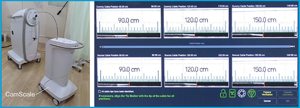 BRAVOSには「CamScale位置確認システム(CamScale)」(図3)というシステムが付属しており,線源停止位置を簡便かつ定量的に評価することができる。BRAVOSとCamScaleを専用の移送チューブでつなぎ,検証を実施する。CamScaleの内部にはスケールとカメラが内蔵されており,90cm,120cm,150cmの停留位置におけるダミーワイヤおよび線源ワイヤの位置誤差が自動で計算される。図3 右は,上段がダミーワイヤ,下段が線源ワイヤで,左から90cm,120cm,150cmの停留位置を示す。自動かつ定量的であるため,実施者の主観にとらわれることなく安全に実施することが可能である。また,誤差が許容値を超えた場合には,ユーザーにより停止位置のキャリブレーションが可能である。キャリブレーションではユーザーによる数値の入力などが不要であるため,ミスのリスクが少ないことも特長である。