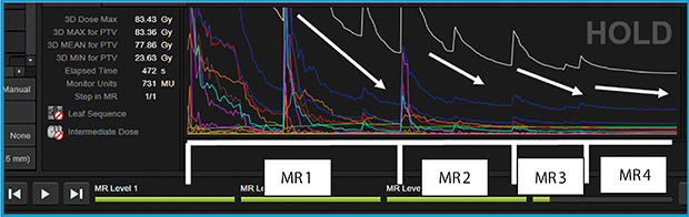 Eclipseは,最適化の開始段階では粗いセグメントによって最適化を行い,徐々にセグメントを細かくする「Multi-Resolution Dose Calculation」というアルゴリズムを用いて最適化を実施している4)。最適化コストの推移を見ると,図2のように序盤のMR levelでは最適化コストの減少が急峻であるのに対して, 終盤になるとコストの減少がなだらかになっている。このことから,Eclipseの最適化では,序盤には線量をダイナミックに変化させ,終盤では線量を調整するような最適化を実施していることがわかる。このMR levelを上手に使うことで,追い込みをかけることが可能である。