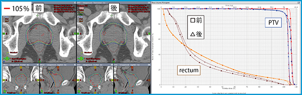 図3に,「Continue the previous optimization」を使用して再最適化を行う前後の前立腺強度変調回転放射線治療(VMAT)の線量分布とDVHを示す。提示例は,膀胱と直腸の線量を低減させたbase planを作成した後に,計画標的体積(PTV)のpriorityを1.5倍程度増加し,Continue the previous optimizationにより再最適化を行い作成した。この手法によりPTV内部の105%の領域が少なくなり,均一な分布となっていることがわかる。再最適化時にPTVのみpriorityを上げたため,直腸の線量は微増しているが,base plan作成時に危険臓器の線量を低減しておくことで,線量制約を満たしたプランを作成することができる。