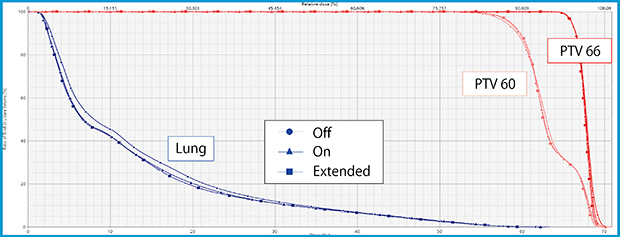 Eclipseは最適化が収束すると,次のMR levelへ自動で進んでいくが,症例によっては収束が不十分なまま次のMR levelへ進行しているため,思うようなDVHが得られない場合がある。そこで,次のMR levelへ向かう時の基準を厳しくし,iterationの回数を増加させる「Convergence mode」を使用することにより,最適化結果が改善できる可能性がある。このConvergence modeは「On」と「Extended」の2種類から選択することができ,収束基準の厳しさやiterationの回数の増加は「Off」<「On」<「Extended」の順になる。Convergence modeを使用するデメリットは,iteration回数の増加による最適化時間の延長であるが,Ver.16.1でのGPUの使用により大幅な改善が可能である。前述のⅢ期肺がんの症例において,Convergence modeを「On」にした場合,Ver. 15.6では26分16秒かかったのに対し,Ver. 16.1では8分59秒になり,Ver.15.6の「Off」の状態の最適化時間(7分40秒)と大きな差はなくなった。DVHに関しては,Convergence modeを「On」とすることでPTV線量均一性が向上し,肺線量が低下した(図4)。なお,Convergence modeの「Extended」については,提示の症例ではDVHは改善傾向にあるが,有用性に乏しいという報告5)があるほか,最適化時間もかなり延長することから,通常の使用においては扱いが難しいと考える。