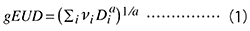 また,等価均一線量の考え方を用いたgeneralized equivalent uniform dose(gEUD)を最適化のobjectとして用いることの有用性も報告されている3)。gEUDは,以下の式(1)で表すことが可能で,最適化のobjectとしては,パラメータaを変更させることで線量体積ヒストグラム(DVH)の関心線量を設定することができる。