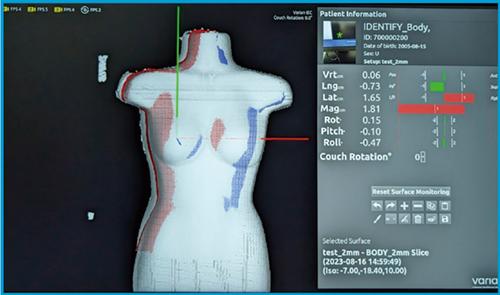 SGRTシステムであるIDENTIFYは,3台のカメラを有し(図1),サブミリメートルの精度で患者の体表面情報をリアルタイムに表示できる。IDENTIFYでは,患者の肌の色に影響されないように青色の可視光のパターンを照射し,そのパターンの歪みから体表面を認識する。ターゲットが動いた場合,画面上では基準画像より前にあるか(赤),後ろにあるか(青)が表示され,6軸の移動距離が表示される(図2)。特定の閾値を設定することが可能である。カメラによるポジショニング精度については,並進1.0mm未満,回転0.5°未満の精度とされている。表面画像の認識速度(frame rate)は後述する関心領域(region of interest:ROI)のサイズに影響を受けるが,1秒間に5~10フレームの画像を取得するとされている。